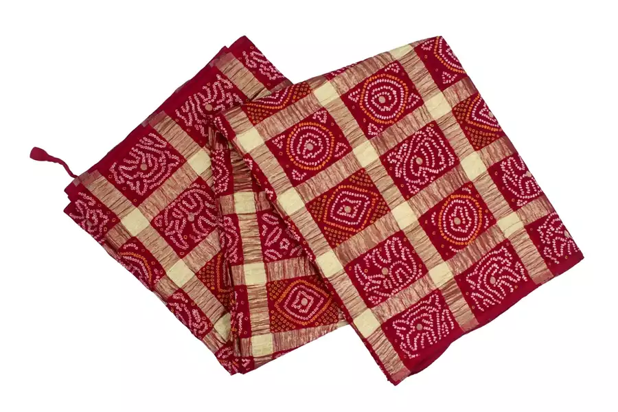 It’s a Ghatchola saree prepared for wedding. A tissue is a material where the warp is of Silk and weft is of Zari. Its border has traditional zig-zag motif called ‘Leheriya’. These two bands in the border where in creeper is made between two bands. The Pallava is made of two bands and alternative red and green leaves. The ‘Kairi’ pattern is made with ‘Tilli’ technique.