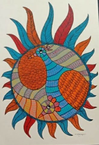Gond Art Large, often overlapping or composite motifs rendered in striking colours and filled with patterns that tell stories of centuries-old beliefs make Gond a unique Birds and animals seated in the shade of a tree with their heads within its lower branches; two Deers with a common head and antlers that emerge like branches of a tree. Birds meshed into the form of a grain container. Birds and animals gathered around the bana, a sacred string instrument, an elephant with wings joyously flying in the blue sky. A Mahua tree with a parrot, tiger, and boar as if emerging from its base. These expressions merging the revered, the real, the mythological and the imagined are the hallmarks of Gond Art. With the outlines of individual and composite forms rendered in flowing lines, each image brought alive with striking colours and filled with patterns, the paintings amaze the viewer with their composition,patterns, colours, creativity and the centuries-old and contemporary stories they tell. And it is their singular beauty that has fascinated art lovers in India and across the world. Gond artists belong to the Pardhan sect of the Gond tribe, one of the largest indigenous communities of Central India, living in parts of Southeast Madhya Pradesh and adjoining areas in Chattisgarh. Traditionally, the Pardhans were bard-priests and from a young age learnt Gond rituals along with myths, legends, and historical events that they narrated during ceremonies. It is this rich oral knowledge (that they inherited and passed down generations) along with the natural world around them that Gond artists draw inspiration from.The origins of Gond painting, now rendered on paper and canvas, are traced to the digna-a pattern made on the floor and walls of home sand courtyard. In 1980s, artists like Jangarh Singh Shyam began painting on paper, and were soon painting dynamic and wondrous compositions filled with small patterns and striking colours drawn from Gond oral narratives. Jangarh Singh Shyam established his own style; made Gond art portable as it came to be worked on paper, cloth, and canvas with pen and ink as well as acrylic paint and established the Gond idiom of painting. He then encouraged his family and other members of the Pardhan community to paint in their individual styles.
